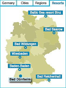 Bad DürrheimSites to seeSpa gardens, spa and wellness centre “Solemar”, historic salt refinery, Fastnacht-Carnival museum, museum of local history Things to doEnjoy spa-treatments such as brine cures or hydro-therapy at “Solemar”, where you can also swim or relax in the sauna, go biking or hiking in the surrounding Black Forest, join excursions in the Black Forest or to Basle, Lake Constance, or Strasburg. How to get thereFrom international airports in Basle, Zurich, Stuttgart, or Munich, or by train via Freiburg. |