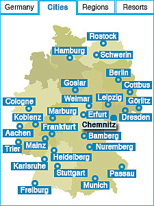 ChemnitzSites to seeThe opera house, town hall, Karl Marx-Monument, medieval “Red Tower”, Rabenstein Castle Things to doExplore the restored Wilhelminian residential areas outside the centre, climb up to Castle Rabenstein, explore the art museum or enjoy the region´s culinary highlights and the Ore Mountains (Erzgebirge) close by. How to get thereFrom the international airports in Berlin, or from the smaller airports in Leipzig, Dresden and Nuremberg, which are within a reasonable range. Suitable train connections from Dresden, Leipzig and Nuremberg. |