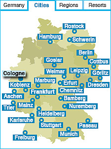 CologneSites to seeCologne Cathedral, World Heritage Site and Germany´s most visited landmark, Romanesque churches in the old town, town hall, Leprechaun fountain, House of “Cologne Water 4711” perfume, Hohenzollern Bridge Things to doEnjoy the frivolous carnival parties in the wintertime, visit the chocolate museum, take a cruise on the river Rhine and visit the romantic castles along its shore, taste the local beer “Kölsch” and of course the wine from the Rhine region, visit the Museum Ludwig with its modern art collection and the Roman Germanic Museum with its collection of local historic art and architecture. How to get thereTo Cologne Airport from Munich or other major European airports, German Railway with express trains from Frankfurt Airport within one hour and from other major cities. |