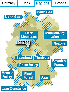Edersee-KellerwaldSites to seeNational park Kellerwald-Edersee, Edersee-Lake, Castle Waldeck, Edersee Dam and Aquapark, Bad Wildungen and Wolfhagen as part of the German fairy-tale route Things to doHike, bike or climb in the national park, swim, sail or water ski on Edersee Lake, take a boat trip on one of the region´s lakes, explore the fairy tales collected by the Grimm brothers on the Fairy Tale Route in Wolfhagen (The Wolf and the Seven Young Kids) and Bad Wildungen (Snow White), take excursions to the Sauerland region, to Cologne, Marburg or Frankfurt How to get thereIt is recommended to rent a car from the international airports in Frankfurt or Cologne |