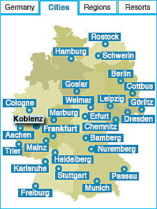 KoblenzSites to seeThe “German Corner” at the confluence of Rhine and Moselle, “Ehrenbreitstein”-Fortress, Electoral Palace with palace gardens Things to doVisit the statue of Emperor William I and the German Corner, take the cable car to Ehrenbreitstein-Fortress overlooking the river and the city, stroll through the palace gardens designed for the Federal Horticultural Show in 2011, take cruises on the rivers of Rhine and Moselle. How to get thereFrom the international airports in Cologne, Düsseldorf or Frankfurt or by fast train from Cologne, Frankfurt, Berlin, Munich or Hamburg. |