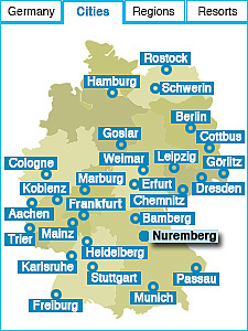 NurembergSites to seeCastle of the Emperors, medieval old town with its historic wall and 80 towers around the city centre, handcrafter district where old traditions of manufacturing are still alive, 14th Century fountain on the main market square Things to doVisit the Albrecht-Dürer-Museum, the toy museum, enjoy the original fried sausage and ginger bread, visit the prison from the 14th century in the historic basements of the city hall, the spooky Executioner House and the Rock-Cut-Cellars, join an excursion to the historic towns of Bamberg and Regensburg, or along the holiday castle route that leads from Heidelberg to Prague and passes Nuremberg and its surroundings. How to get thereDirectly to Nuremberg national airport or by train from Frankfurt, Munich, or Berlin. |