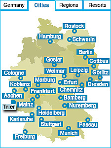 TrierSites to see“Porta Nigra” city gate, Basilica of Constantine, Kaiserthermen bath, Trier Cathedral, Elector´s Palace, the historic city centre with market square, Karl-Marx-House Things to doExplore Roman ancient history while walking through the old town, visit the Karl-Marx-Museum, be enchanted by UNESCO World Heritage sites from different eras, enjoy the beauty of the Moselle on the river front, take an excursion to Luxembourg or join a cruise on the river Moselle. How to get thereFrom international airports in Luxemburg, Cologne and Frankfurt. |