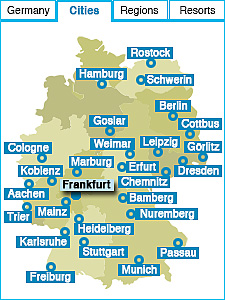 Frankfurt on the MainSites to seeThe historic town hall “Römer”, Cathedral and St. Paul’s Church, “Zeil” shopping boulevard, “Palmengarten” botanic garden, skyscrapers at the central business district Things to doEnjoy the appealing contrast between modern skyscrapers and the historic old town, shop at high-class stores, drink the local specialty “Ebbelwoi” cider in the lively quarter of Sachsenhausen, visit the Städel-Museum with its impressive art collections of different periods. How to get thereBy international flights to Frankfurt from all corners of the world, fast train connections from all German cities and from plentiful continental European railway stations. |